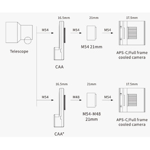 Malgré son poids léger, le ZWO CAA offre des performances exceptionnelles. Avec une épaisseur de 16,5 mm, il remplace l'adaptateur ZWO standard. Son poids n'est que de 465 grammes. Le ZWO CAA est équipé d'un moteur pas à pas hautement efficace pour un fonctionnement fluide et précis, qui peut être réglé avec précision à l'angle souhaité. Sa structure robuste garantit une rotation à 360° sans basculement et assure un fonctionnement stable et précis. Le ZWO CAA règle l'angle de la caméra avec une précision de 0,02° à chaque pas.