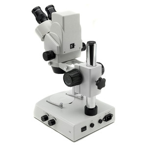 L'éclairage du SZM-2 est assuré par un système réglable séparément pour la lumière incidente et la lumière transmise. Il se compose de deux ampoules halogènes de 12 V/15 W. Il nécessite une alimentation électrique de 230 V/50 Hz. Le modèle est également équipé d'une platine noir et blanc et d'une platine en verre dépoli. Vos préparations peuvent être fixées et maintenues en place à l'aide des pinces à préparations.