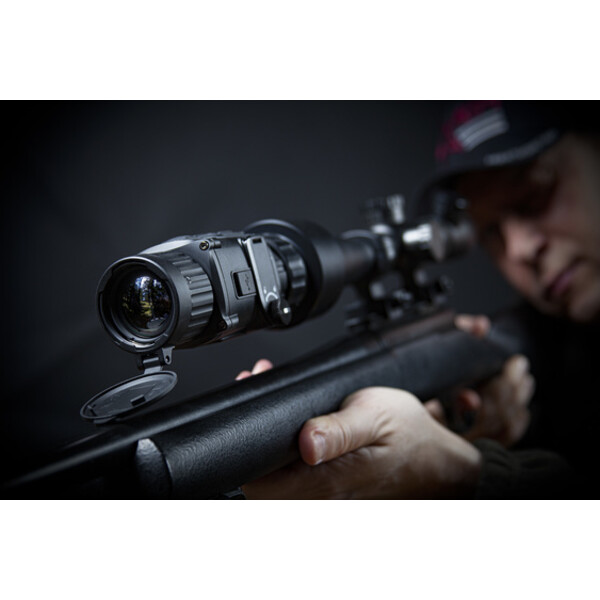 L'AGM Rattler TC35-384 peut être facilement monté devant des lunettes de visée avec un grossissement jusqu'à 8 fois pour une utilisation à moyenne portée.