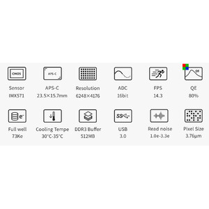 - Haute résolution grâce aux pixels de 3,76 µm - idéal pour les télescopes lumineux et nets, tels que les Apos, Hyperstar, Celestron Faststar, les télescopes Newton lumineux