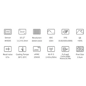 L'un des avantages du capteur CMOS rétroéclairé est le faible bruit de lecture et la sensibilité améliorée. Sony utilise notamment la technologie STARVIS 2 pour le capteur IMX585, qui garantit une excellente visibilité même en cas de faible éclairage. Vous pouvez obtenir un rendement lumineux très élevé pour les prises de vue astronomiques et une qualité d'image élevée non seulement dans la lumière visible, mais aussi dans le proche infrarouge (pour réduire le seeing). De plus, le faible bruit de lecture et la capacité Full Well élevée garantissent une plage dynamique plus large. Combinée au grand champ de vision offert par le grand format du capteur, l'ASI585MC est non seulement idéale pour les prises de vue du soleil, de la lune et des planètes, mais peut également être utilisée comme caméra de streaming en direct.