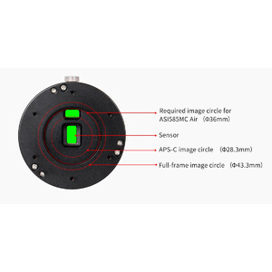 Exigences relatives au télescope : les caméras ZWO Air sont compatibles avec les télescopes prenant en charge les formats d'image APS-C ou supérieurs. Lors de l'utilisation d'un télescope avec un cercle image APS-C, de légères distorsions peuvent apparaître sur l'étoile guide. Pour un suivi plus précis et plus stable (autoguidage), nous recommandons l'utilisation d'un télescope avec un cercle image plein format ou supérieur.