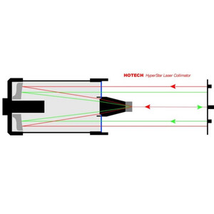 Grâce à l'astucieux collimateur laser HyperStar SC, vous pouvez régler votre télescope Schmidt-Cassegrain en peu de temps et avec une précision extrêmement élevée. Vous n'avez pas besoin d'un ciel dégagé, ni d'une étoile. Ce dispositif de réglage Hotech se compose d'une cible dans laquelle sont intégrés trois lasers différents. Avant le réglage, la cible est placée devant l'ouverture de votre télescope. Les rayons laser frappent le miroir principal, sont réfléchis et reviennent sur la cible.