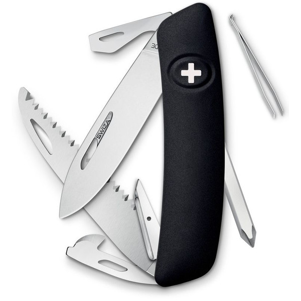 Le couteau suisse SWIZA D06 avec son design révolutionnaire à 360° et sa forme incurvée permet une prise en main optimale, facilitée par sa texture agréable au toucher, souple, anti glisse et particulièrement résistante. Le design savamment étudié offre un accès direct aux outils, eux-mêmes perforés pour faciliter leur ouverture aussi bien pour un gaucher qu’un droitier: une lame de 75mm avec blocage de sécurité, une scie, une alène coupante avec poinçon, une aiguille à chas, un décapsuleur avec un tournevis N°3 et un plioir à fil, un ouvre-boîte avec tournevis N°1, un tournevis Phillips N°1-3 et une pincette.