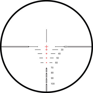 Cercles illuminés pour voir « au travers », avec une zone de tir de 2 pouces à distance équivalente. Les traits de 6 et 12 pouces sont calculés pour la distance équivalente. Calibré pour 340 fps.