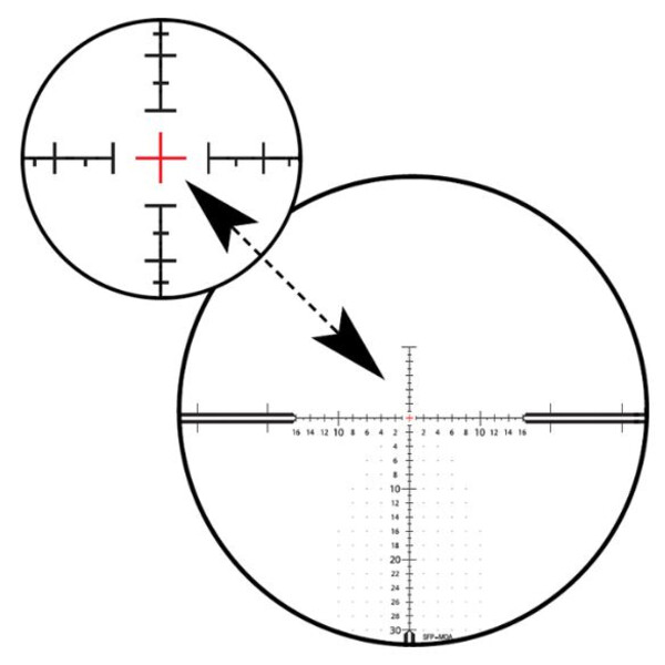 Le réticule ZMOAi-T30 est la version éclairée du ZMOA-T30. Il offre un équilibre parfait entre le tir sportif et la chasse. Les chasseurs et les tireurs sportifs préfèrent cette option pour leur lunette de visée Allround. Le réticule MOA (Minute of Angle) comprend des lignes de repère MOA et des points qui, au grossissement de référence, offrent un écart de 1 MOA et couvrent une chute de balle de 30 MOA. Les lignes latérales et les points d'arrêt sont extrêmement utiles pour la correction du vent et sont placés de manière à offrir une efficacité maximale et une distraction minimale dans le champ de vision. L'éclairage du réticule se limite à la fine croix centrale, ce qui évite l'éblouissement du tireur et offre un point de visée extrêmement efficace et précis dans des conditions de faible luminosité. La modification des dimensions de couverture et les valeurs qui en résultent pour compenser la chute de la balle et corriger la dérive due au vent peuvent être déterminées rapidement et précisément pour pratiquement toutes les munitions à l'aide de l'application ZEISS Hunting.