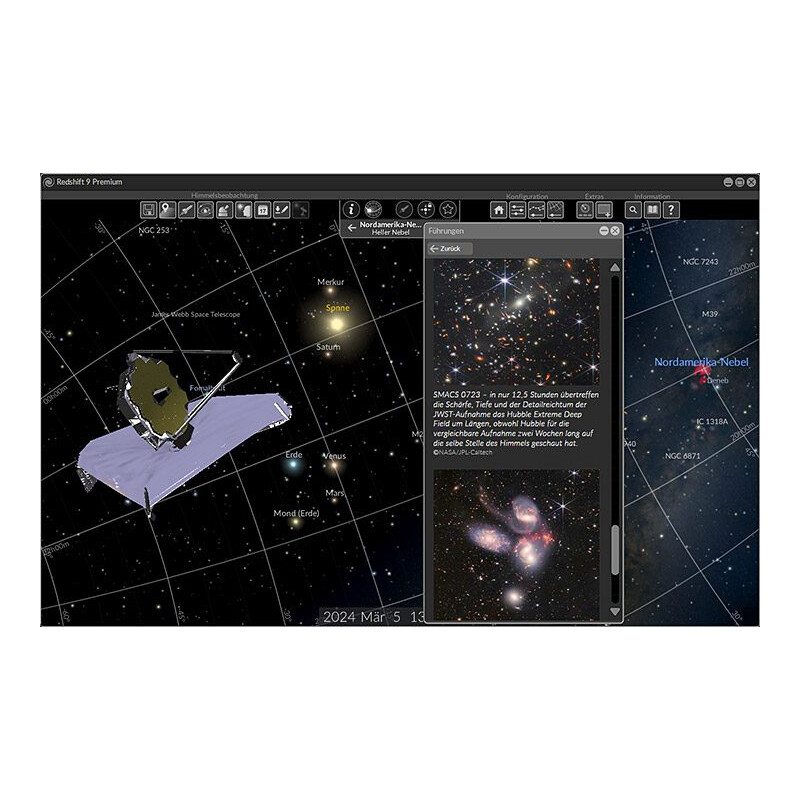Contemplez le ciel nocturne dans toute sa splendeur, voyagez vers les étoiles et les galaxies lointaines, atterrissez sur des corps célestes ou tournez autour de la Terre en temps réel. Planifiez vos observations du ciel et contrôlez votre télescope avec Redshift 9 Premium.