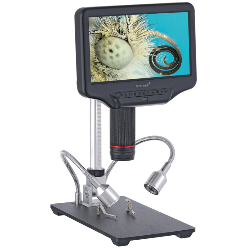 La diagonale de l'écran intégré mesure 17,8 cm. L'image capturée par l'objectif est colorée, claire et très contrastée. L'écran peut également être légèrement incliné afin de réduire la fatigue lors d'observations prolongées. Le grossissement total peut être réglé dans une plage de 5 à 270 fois, le grossissement optique est de 5 à 40 fois. La connexion HDMI vous permet également d'afficher l'image sur un écran externe.