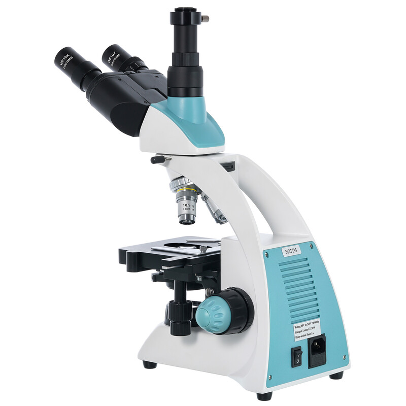 La tête inclinée permet une observation confortable ; elle comporte une partie visualisation et un tube vertical additionnel pour y monter une caméra numérique (vendue séparément). La tête tourne sur 360°. Le kit inclut deux oculaires grand angle et quatre objectifs achromatiques de différents grossissements. Sur la partie inférieure, le microscope comporte des boutons de mise au point. Ils permettent un réglage grossier et fin. Le microscope est conçu pour les observations en fond clair. L'objectif d'un grossissement de 100x permet des observations avec de l'huile d'immersion. Les lentilles frontales des objectifs à grossissement 40 et 100x sont montées sur ressort pour les protéger en cas de contact brutal.