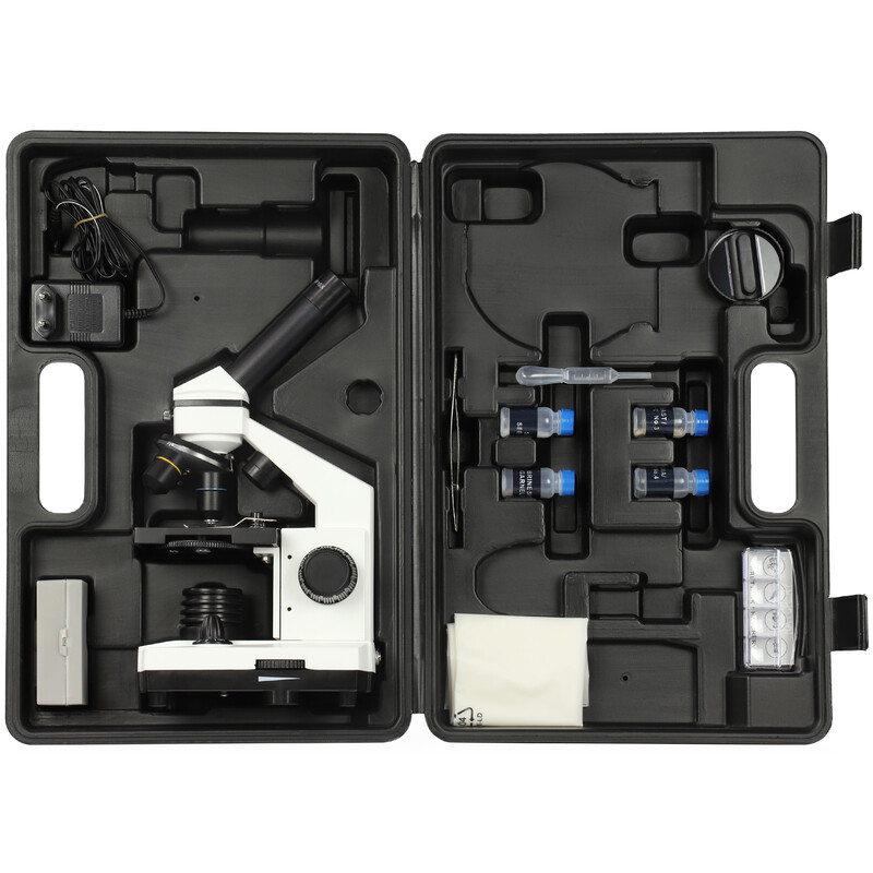 Un oculaire (WF 10x) et trois objectifs différents dans la tourelle porte-objectif. Vous choisissez ainsi le grossissement que vous souhaitez, de 40x à 400x. Pour un microscope de cette catégorie, il s'agit là de grossissements judicieux. Vous bénéficiez constamment d'une image lumineuse et très contrastée.