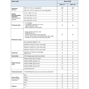 - D’autres options, telles qu’un choix d’oculaires, d’objectifs, de valets et d’autres unités de contraste de phase peuvent être intégrées sous forme d’accessoires