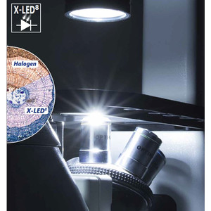 Transmitted illumination: X-LED8 with white 8 W LED (6,300K) with brightness control. With aperture diaphragm. Multi-plug 100-240Vac/6Vdc external power supply.