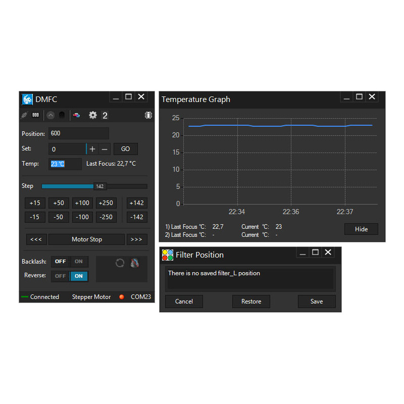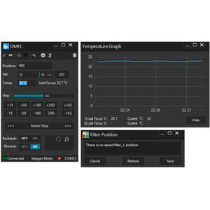 Temperature Probe: A digital probe of one meter length is supplied. The probe can be placed near the focuser so the exact temperature of the focuser / environment can be seen through the supplied software or ASCOM driver