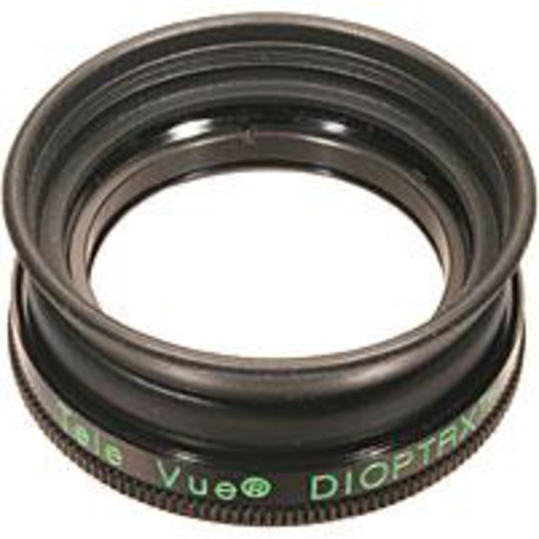 Un oculaire ne peut que corriger une erreur sphérique optique comme la myopie. Le Dioptrx vous permet simplement de corriger la forme régulière d'astigmatisme, liée directement à l'oculaire. Par rapport à une paire de lunettes, le Dioptrx dispose d'une bonnette et de cette facon d'une protection contre la lumière résiduelle. Le Dioptrx se laisse fixer sur l'oculaire et est aussi doté d'un mouvement de rotation, ce qui permet de régler la parfaite position de l'axe de courbure de votre cornée. Une série de lettres gravées sur la bague aide à contrôler la position d'orientation. Naturellement, les surfaces des verres optiques sont revêtues d'un traitement multicouche pour empêcher la réflexion et, les verres sont sertis dans une bague en aluminium anodisé avec une bonnette en caoutchouc.