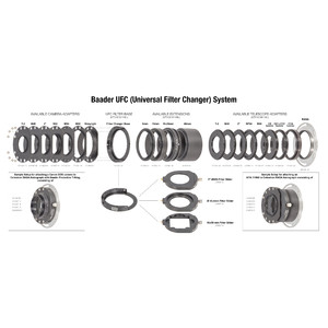 Le Universal Filter Changer, UFC : Le système Baader UFC est un tiroir filtre utilisable pour les systèmes de télescopes et de caméras les plus divers, avec un diamètre de raccordement suffisamment grand, qui est en même temps extrêmement court, mais qui accepte aussi des tailles de filtres jusqu'à 50x50mm sans vignettage. Ces caractéristiques sont indispensables pour pouvoir utiliser les nouvelles optiques rapides telles que les télescopes EdgeHD avec Hyperstar et les nouveaux instruments RASA de Celestron, ainsi que tous les autres astrographes Prime-Focus avec des filtres appropriés, sur lesquels une roue à filtres régulière ferait trop d'ombre à l'ouverture frontale. De plus, les optiques Prime-Focus sont inévitablement équipées d'un backfocus très court et nécessitent un tiroir à filtres particulièrement peu encombrant.