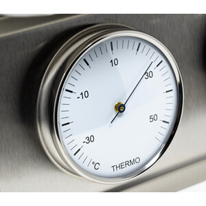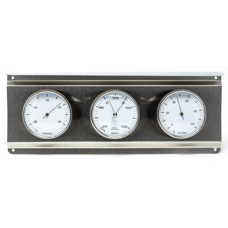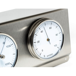 Station météo dans un boîtier en acier inoxydable avec thermomètre, baromètre et hygromètre. Dimensions 390 x 145 mm. Les accessoires de montage sont inclus dans la livraison. Un manuel contenant les principales règles météorologiques est inclus.