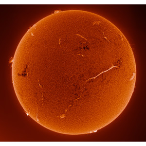Ils sont équipés d'un étalon de haute qualité de Coronado qui filtre la raie spectrale de l'hydrogène solaire appelée H-Alpha. À la lumière de l'hydrogène excité, la chromosphère du soleil devient visible, sur laquelle il y a toujours quelque chose à voir : filaments, éruptions et autres phénomènes sur le disque solaire et protubérances au bord du soleil.