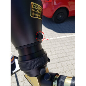 Blocking Filter BF (filtre bloquant) : le porte-oculaire intègre l'optique de déflexion et le filtre bloquant. Ce filtre réduit la luminosité de l'image du Soleil et constitue donc une partie très importante de l'ensemble du système de télescope solaire. Il ne doit en aucun cas être retiré ! Pour une observation purement visuelle, un petit filtre bloquant suffit, mais pour la photographie, il faut en choisir un plus grand.