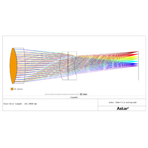 L'Askar 50P est un apochromatique à 4 éléments selon Petzval. L'objectif est équipé d'un verre SD pour une bonne correction de l'aberration chromatique. L'apo est corrigé pour les appareils de prise de vue jusqu'au plein format.