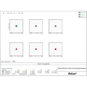 Contrairement aux autres modèles de la série, le 65PHQ est équipé d'un système optique à cinq lentilles (quintuplet). Trois lentilles, dont deux en verre ED, forment l'objectif, tandis que deux autres lentilles situées dans la partie centrale du tube constituent le correcteur de champ. Cela permet une excellente correction de l'aberration chromatique et garantit une distorsion extrêmement faible des étoiles situées à la périphérie du champ de vision.