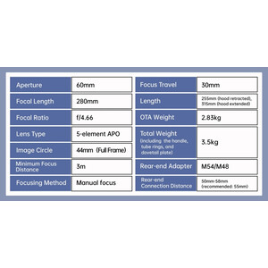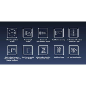 - Rapport d'ouverture rapide de f/4,66 : haute capacité de collecte de lumière pour la prise de vue d'objets du ciel profond à grand champ, qui permettent de distinguer les détails même avec des temps d'exposition courts.