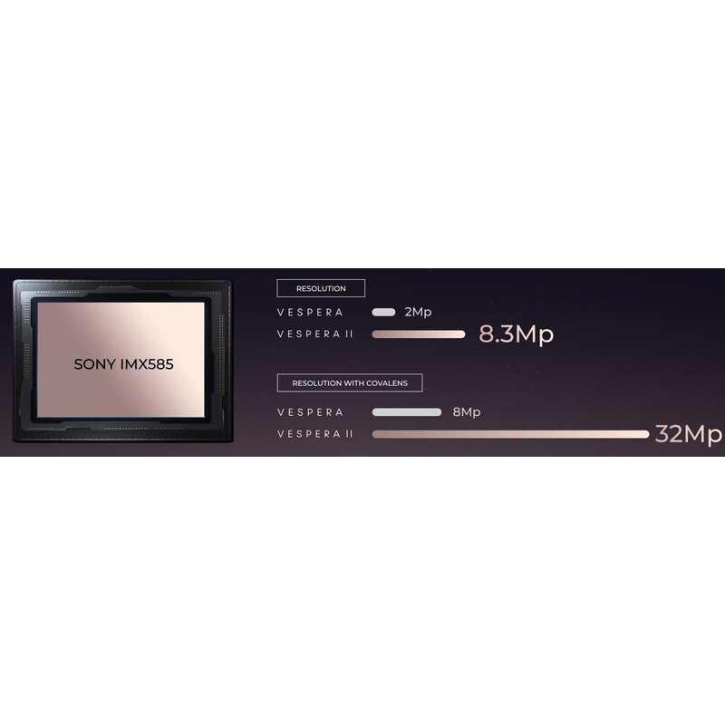 Capteur Sony haute sensibilité : Vespera II utilise l'un des derniers capteurs Sony, conçu pour les conditions de très faible luminosité. Vaonis a également développé sa propre carte électronique afin d'assurer une gestion optimale de la chaleur. Un capteur chaud est synonyme de nombreux défauts d'image, c'est pourquoi la carte du capteur est conçue pour dissiper un maximum de chaleur.