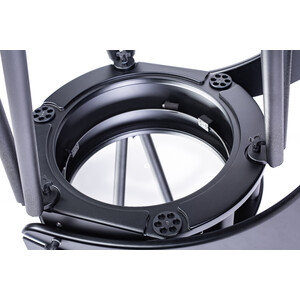 • Collimation pratique : tout télescope Newton doit, régulièrement, faire l’objet d’une collimation. Le Taurus rend cette opération particulièrement facile. Pas besoin du moindre outil. La collimation se fait par le biais de trois molettes dans la partie supérieure de la boîte à miroir. Vous n'avez donc pas besoin de tendre la main à l'aveuglette sous le miroir, comme c'est le cas avec de nombreux autres télescopes Dobson. Grâce à l'utilisation de ressorts, pas besoin non plus du moindre contre-écrou. Le marquage central sur le miroir primaire permet une collimation précise