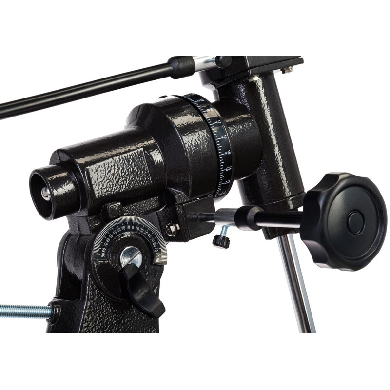 La monture EQ-1: Cette monture équatoriale offre déjà la possibilité d'aligner les optiques avec exactitude sur l'étoile polaire. On peut régler la bonne distance polaire et la latitude géographique pour n'importe quel lieu d'observation. Les mouvements micrométriques sur les axes d'ascension droite et de déclinaison permettent de pointer et suivre les objets avec précision, tandis qu'un contrepoids assure l'équilibrage de l'optique.