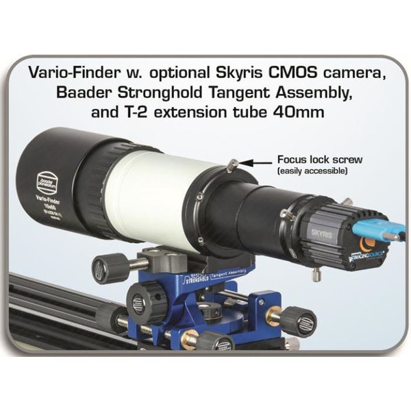 Le Vario Finder est polyvalent, car il offre de nombreuses possibilités pour adapter les accessoires. Grâce à un coulant de 1,25 pouce, les oculaires standards peuvent être utilisés. Le renvoi coudé Amici de 1,25 pouces, est idéal pour les observations de la nature. En astronomie, il offre une vue agréable. Le kit chercheur comprend également un oculaire de 25mm avec réticule lumineux. En outre, un filetage T-2 permet de rajouter des accessoires T-2 supplémentaires. Bien sûr, la platine d'adaptation à queue d'aronde en fait partie, elle peut être fixée sur les montures habituelles. Elle dispose également d'un filetage photo de ¼ de pouce, par conséquent, le Vario Finder peut également être monté sur n'importe quel trépied photo.